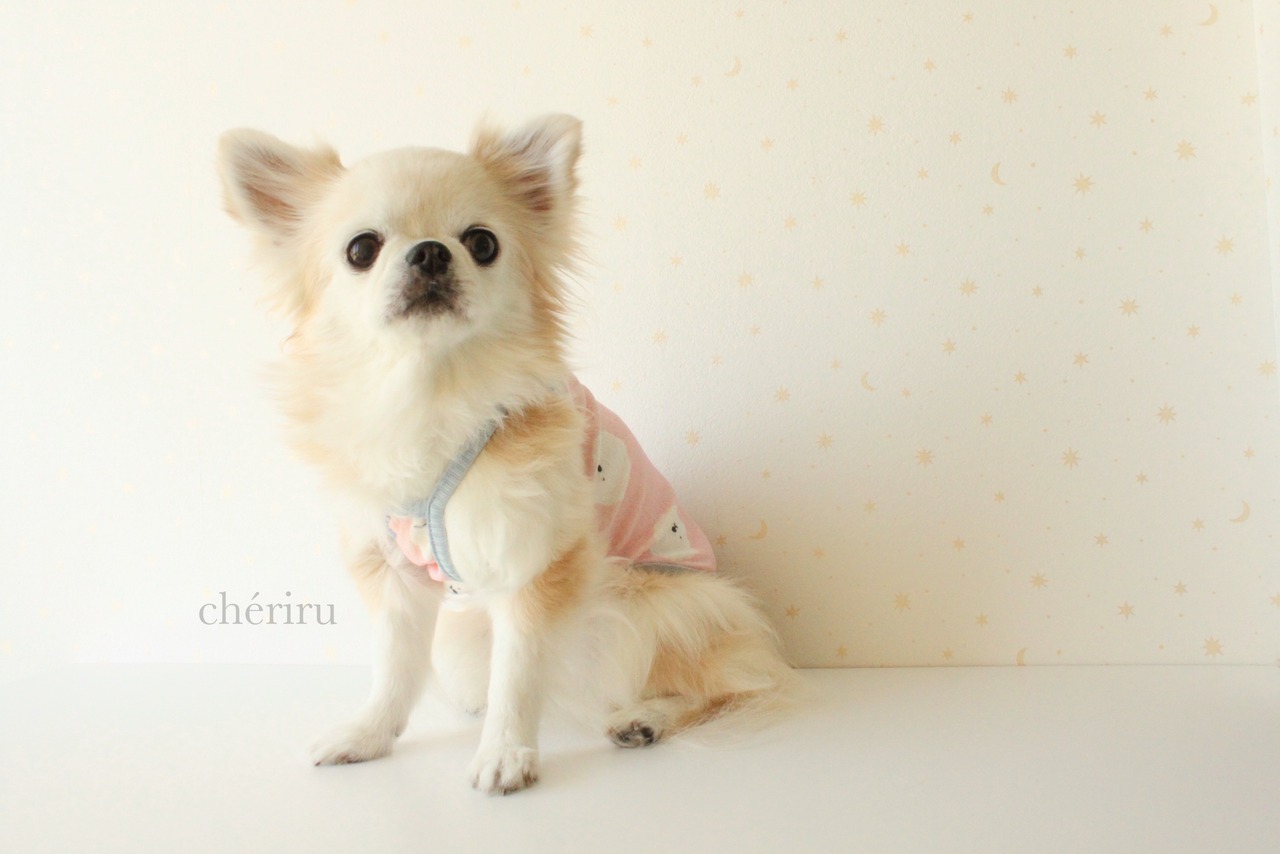 model : チワワ 3.6kg(首回り24cm、胸囲39cm、背長さ36cm) Mサイズ着用