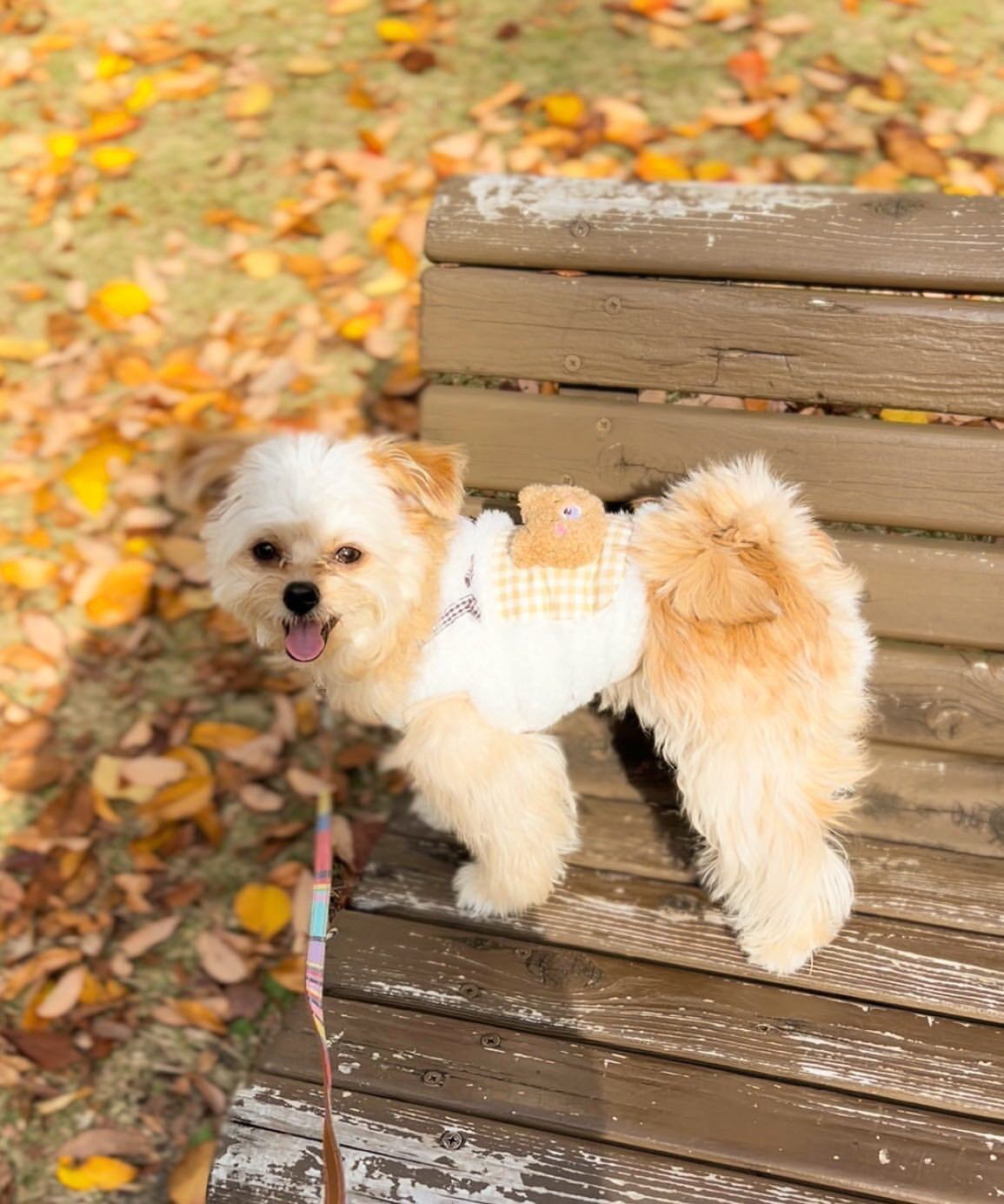 model : チワワ 3.5kg(首回り24cm、胸囲39cm、背長さ36cm) Mサイズ着用