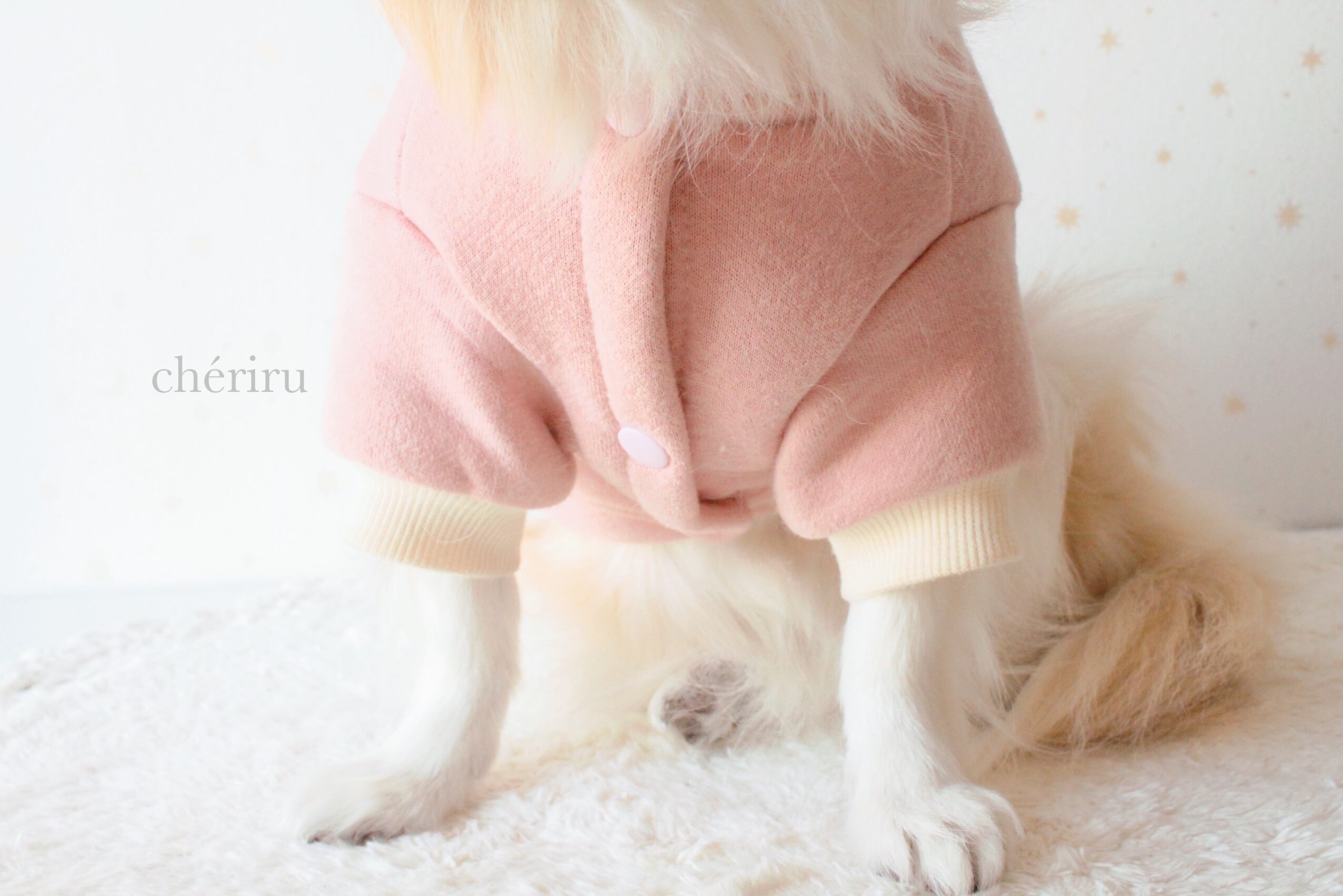 model : チワワ3.6kg(首回り24cm、胸囲39cm、背長さ36cm) Sサイズ着用