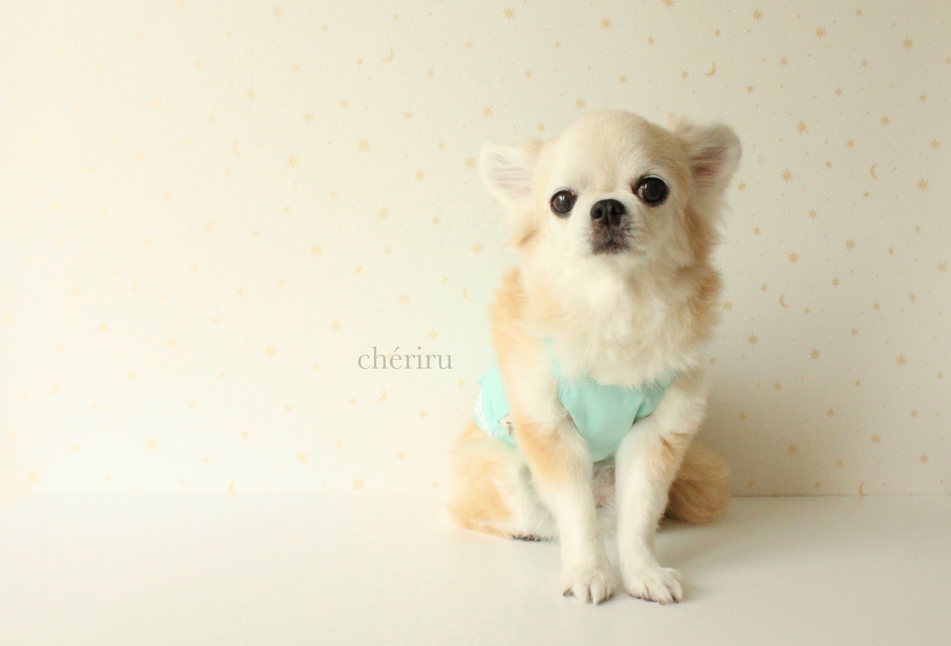 model : チワワ 3.6kg(首回り24cm、胸囲39cm、背長さ36cm) Lサイズ着用
